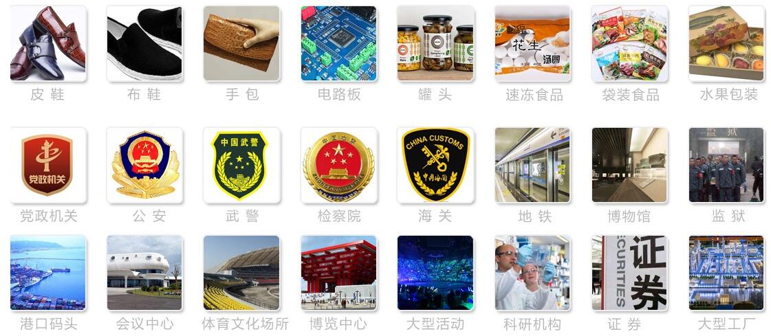 公安武警、法院、監(jiān)獄、地鐵、海關(guān)車站、港口碼頭、物流快遞、酒店學(xué)校、工廠企業(yè)及其他公共場(chǎng)所的重要部門。主要用來檢測(cè)大件貨物、包裹、郵件、箱包、等物件中所隱藏的違禁物品和易燃易爆品,如管制刀具、槍支、煙花爆竹、酒精乙醇、汽油硫酸的等。