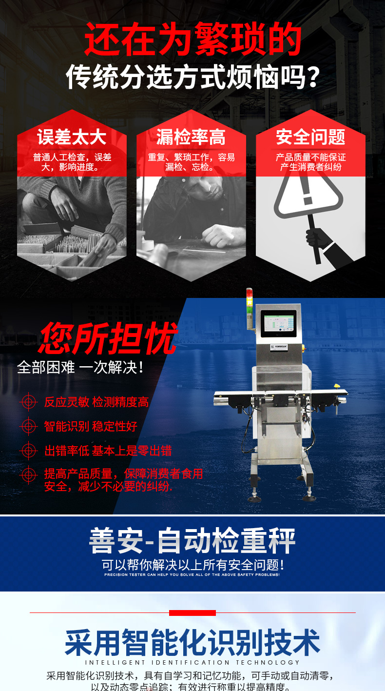廣泛應用于電子、制藥、食品、飲料、保健品、日化、輕工、農副產品等多行業。尤其適用于制藥保健品行業檢測片劑藥品是否少粒、多粒;粉末袋裝藥品是否缺袋、多袋;液體狀藥品重量是否達到標準要求;藥品附件缺失檢測(如說明書、干燥劑等)。