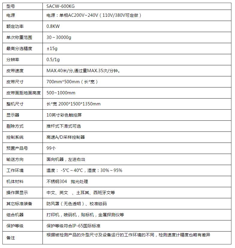 SACW-600KG大重量自動稱重機是一種高速度、高精度的在線檢重設備,可與各種包裝生產線以及輸送系統集成,主要用于在線檢測產品重量是否合格,包裝內是否缺少部件或說明書等。廣泛應用于制藥、日化、食品、化工、電池、五金配件、電子、塑膠等行業,操作簡單,檢測精度高,有效提高生產效率。