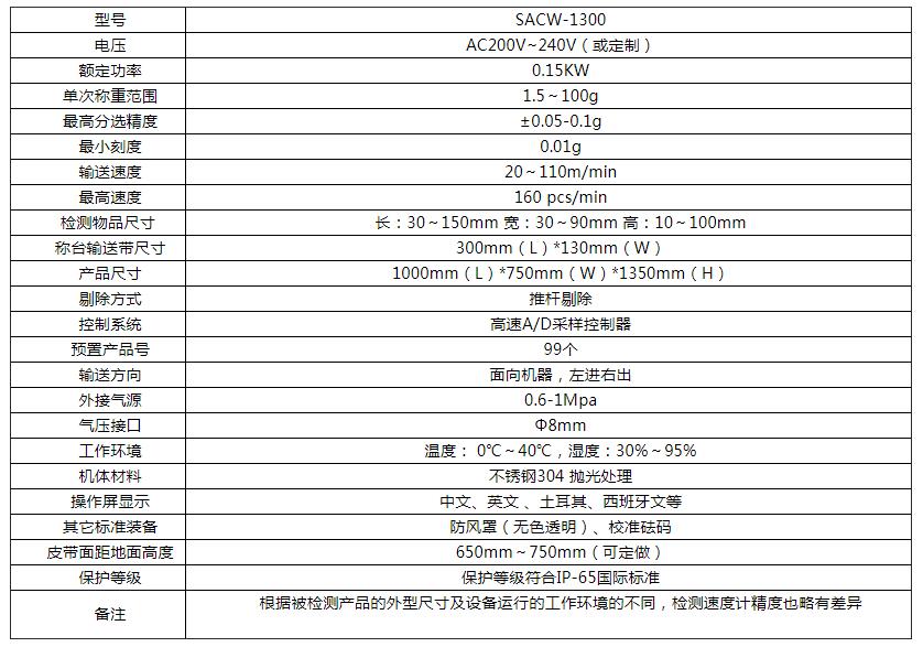 SACW-1300全自動(dòng)在線重量選別機(jī),又名:自動(dòng)稱(chēng)重機(jī)、欠重檢測(cè)機(jī)、重量分選機(jī)、自動(dòng)稱(chēng)量機(jī)、重檢機(jī)、檢重秤等。是一種高速度、高精度的在線檢重設(shè)備,可與各種包裝生產(chǎn)線以及輸送系統(tǒng)集成,主要用于在線檢測(cè)產(chǎn)品重量是否合格,包裝內(nèi)是否缺少部件或說(shuō)明書(shū)等。能廣泛應(yīng)用于制藥、日化、食品、化工、電池、五金配件、電子、塑膠等行業(yè)。