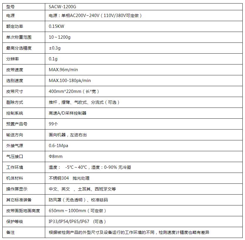 SACW-1200G重量分選機是一種高速度、高精度的在線檢重設備,可與各種包裝生產線以及輸送系統集成,主要用于在線檢測產品重量是否合格,包裝內是否缺少部件或說明書等。又名:欠重檢測機、重量選別機,在線檢重秤、自動稱量機、重檢機、檢重秤等。能廣泛應用于制藥、日化、食品、化工、電池、五金配件、電子、塑膠等行業。