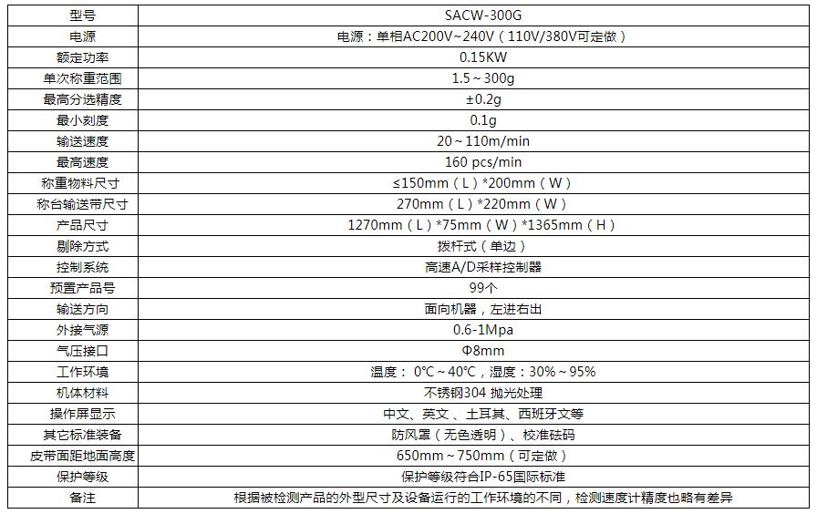 SACW-300G重量選別秤是一種應用于各種自動化流水線以及物流輸送系統上的自動重量檢測、上下限判別或根據重量檢測產品是否合格的高科技自動化分選設備。通用型稱重選別稱比較適用于盒裝、包裹箱裝、單品樣品包裝產品在線自動稱重檢測、欠重檢測、漏裝檢測,附件缺失檢測等,廣泛用于食品、制藥、日化、電子、工業品、五金、軍工等重量品質檢測苛刻行業產品。