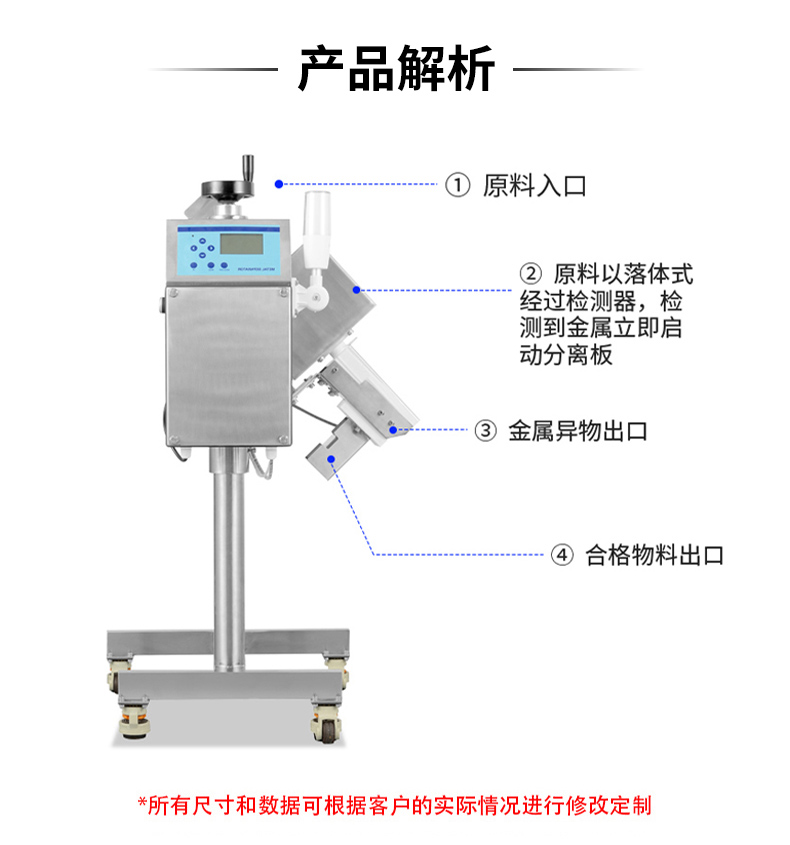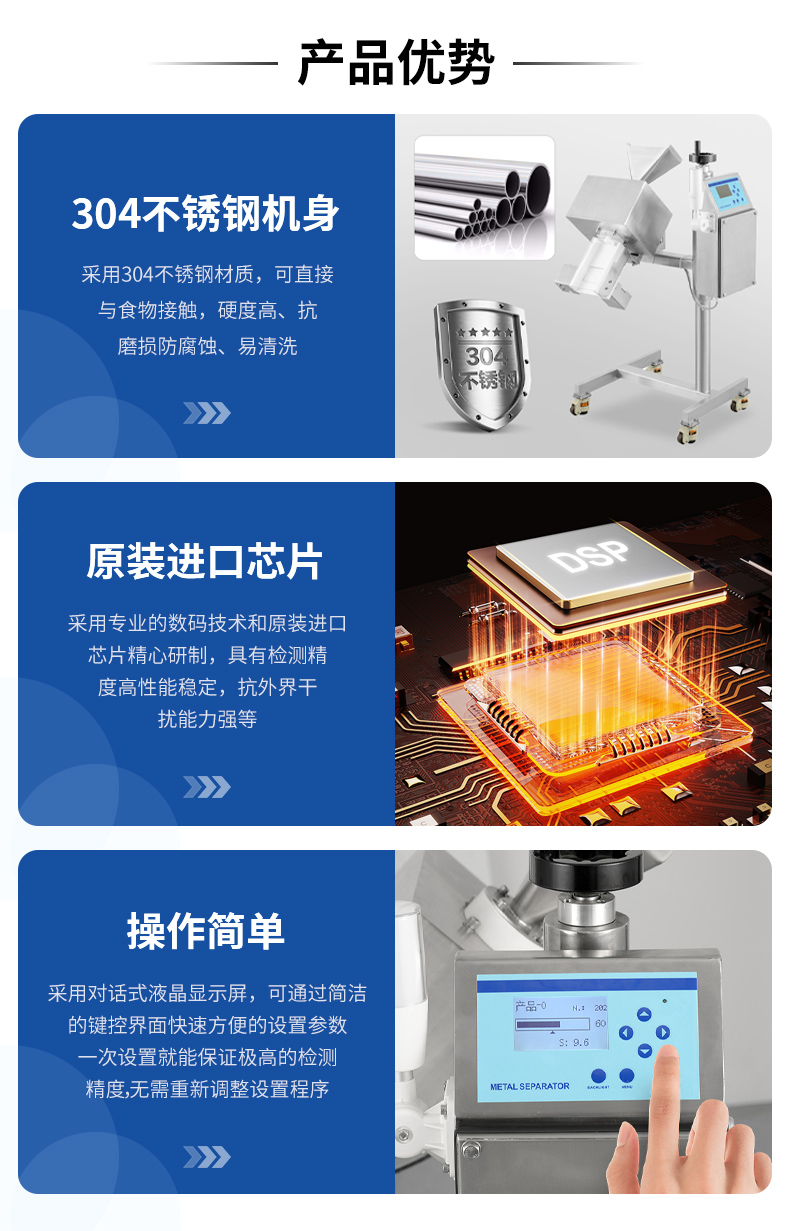 德國技術,高端產品,具備高精度,高靈敏度,高可靠性;用于從自由落體的散料中分離磁性及非磁性金屬,采用特殊的軟件設計,提高了檢測性能。具備產品效應自動手動學習功能;集成金屬異物快速剔除系統,適合檢測散料產品,即使金屬被密封在產品中也能檢測出來。智能檢測,免維護,節(jié)約成本使用。多種口徑可選,型號滿足所有實際應用。防護等級:IP65,符合HACCP和CE認證。報警方式采用聲音報警,自動剔除