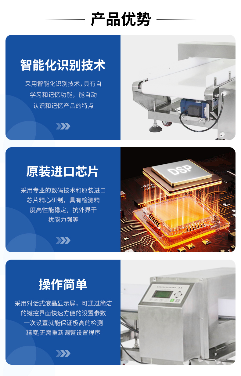 全數字金屬檢測機推出新一代微電腦智能型高靈敏度,高可靠性觸摸屏界面金屬檢測機,產品采用雙回路電路設計,7寸超大全彩色波晶觸摸屏,操作更方便,更直觀,此全金屬檢測機器,可檢測鐵和非鐵等金屬,靈敏度可調節,帶記憶功能可預設100種檢測產品的參數,突破大部分設備只對磁性物質反應靈敏的技術瓶頸,檢測機器采用聲光報警,同時自動停機,或報警不停機,可加裝剔除功能,防腐蝕、不生銹、易清洗。因此廣泛應用于食品、藥品、玩具、化工等要求高的物體里的金屬檢測。