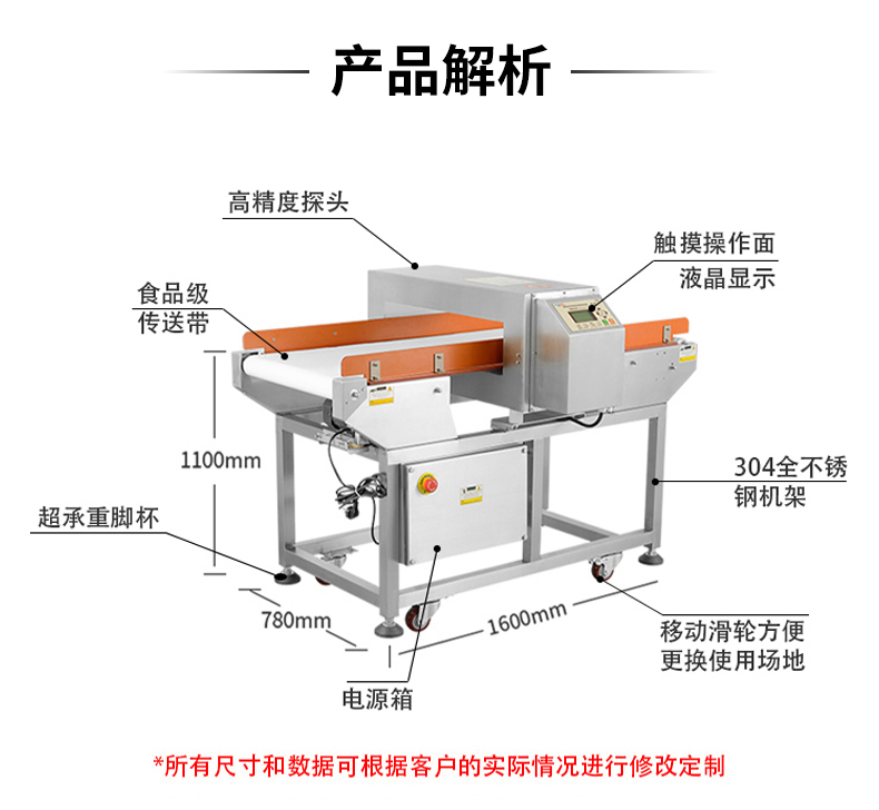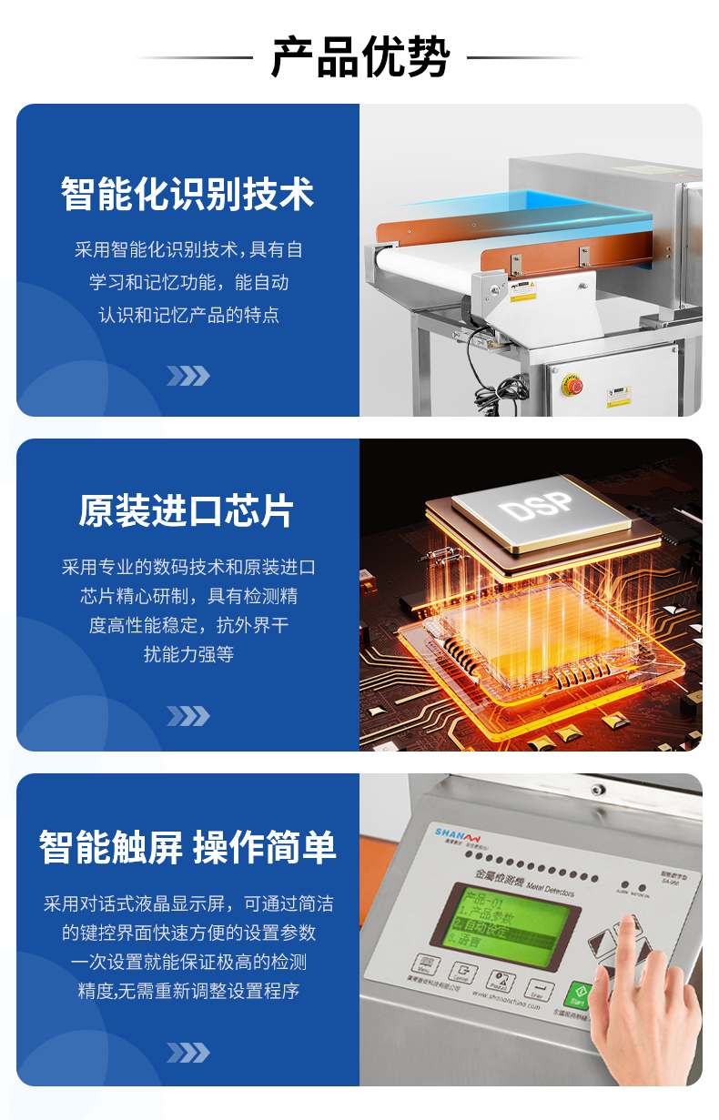 全數(shù)字金屬檢測機推出新一代微電腦智能型高靈敏度,高可靠性觸摸屏界面金屬檢測機,產(chǎn)品采用雙回路電路設計,7寸超大全彩色波晶觸摸屏,操作更方便,更直觀,此全金屬檢測機器,可檢測鐵和非鐵等金屬,靈敏度可調(diào)節(jié),帶記憶功能可預設100種檢測產(chǎn)品的參數(shù),突破大部分設備只對磁性物質(zhì)反應靈敏的技術瓶頸,檢測機器采用聲光報警,同時自動停機,或報警不停機,可加裝剔除功能,防腐蝕、不生銹、易清洗。因此廣泛應用于食品、藥品、玩具、化工等要求高的物體里的金屬檢測。