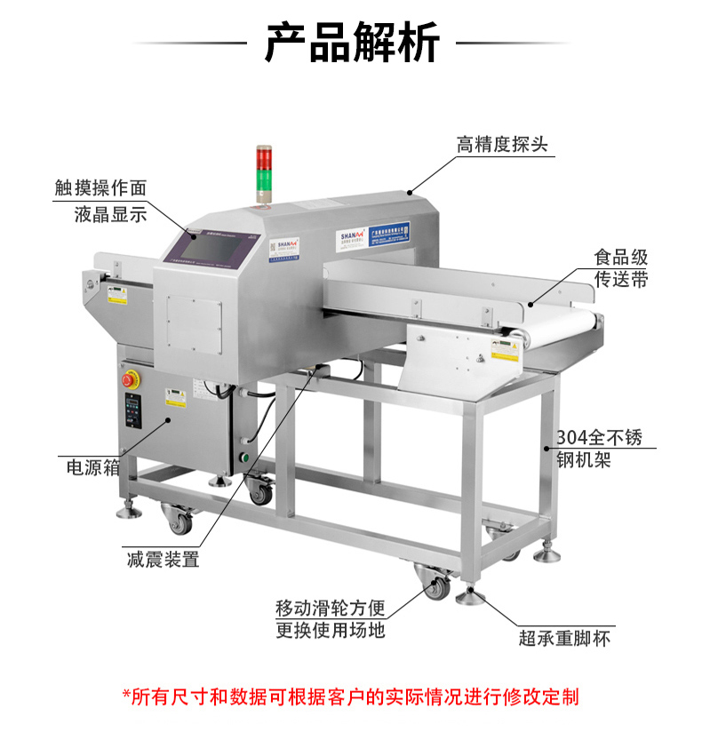 全數字金屬檢測機推出新一代微電腦智能型高靈敏度,高可靠性觸摸屏界面金屬檢測機,產品采用雙回路電路設計,7寸超大全彩色波晶觸摸屏,操作更方便,更直觀,此全金屬檢測機器,可檢測鐵和非鐵等金屬,靈敏度可調節,帶記憶功能可預設100種檢測產品的參數,突破大部分設備只對磁性物質反應靈敏的技術瓶頸,檢測機器采用聲光報警,同時自動停機,或報警不停機,可加裝剔除功能,防腐蝕、不生銹、易清洗。因此廣泛應用于食品、藥品、玩具、化工等要求高的物體里的金屬檢測。