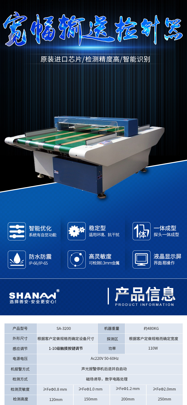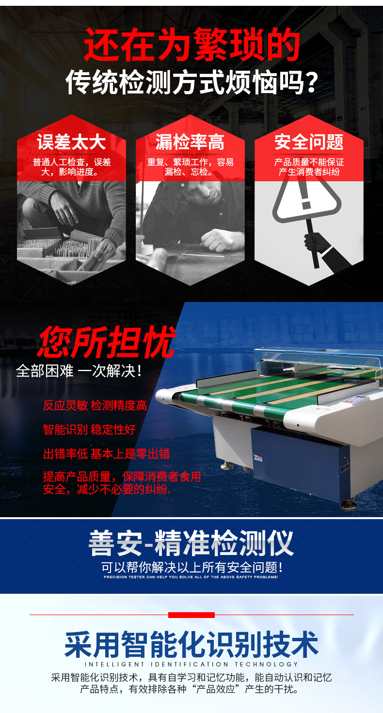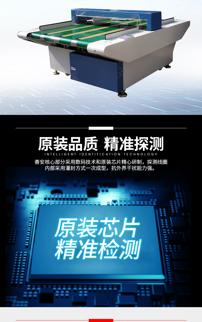 適用于床上用品、玩具、服裝、制鞋、化工、皮革、針織、印刷等行業檢測產品或原料在生產過程中混入的金屬雜質。如:鐵、非磁性金屬物品(金、銀、銅、鋁、不銹鋼等有色金屬都可以檢測出),提高產品安全系數,減少危害。