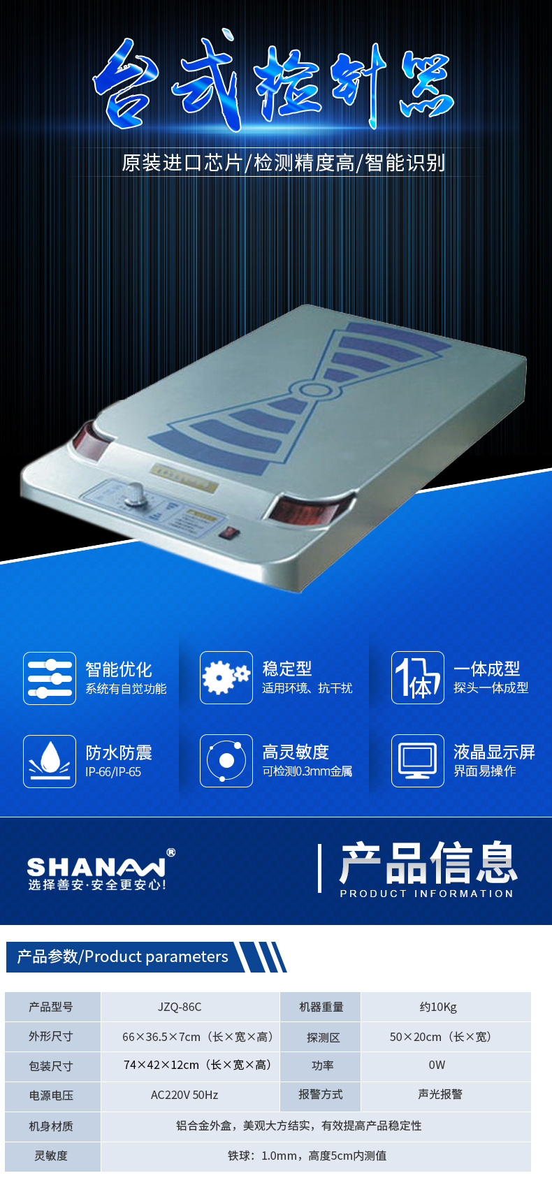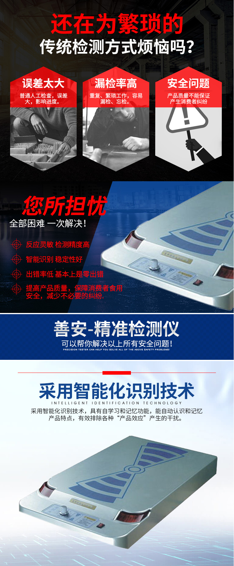 用于少量的小件服裝、毛絨、領帶、毛巾、圍巾、襪子、拉鏈、藥品、食品等以及一些未列出行業制品的斷針、刀片、金屬碎片、鐵磁性金屬等金屬雜質檢測