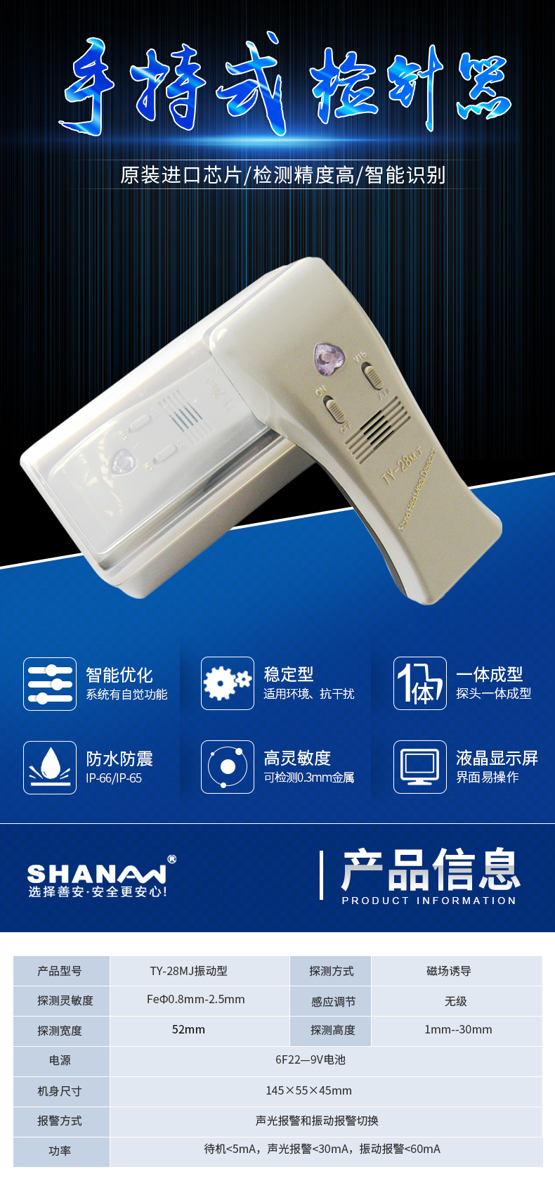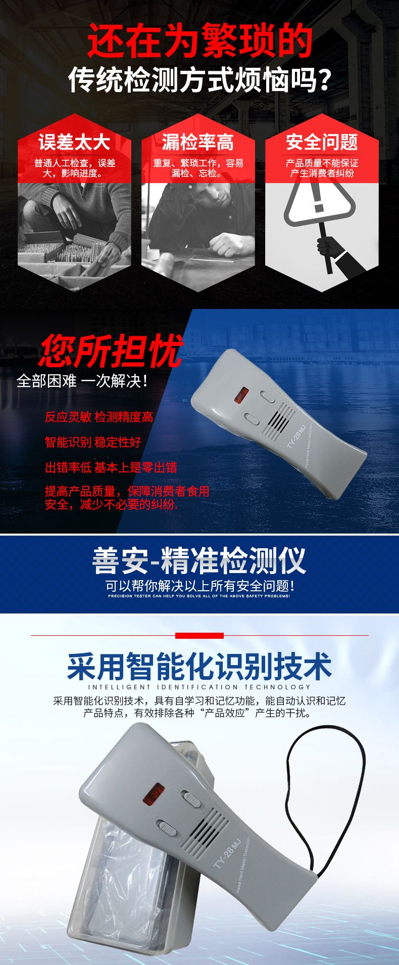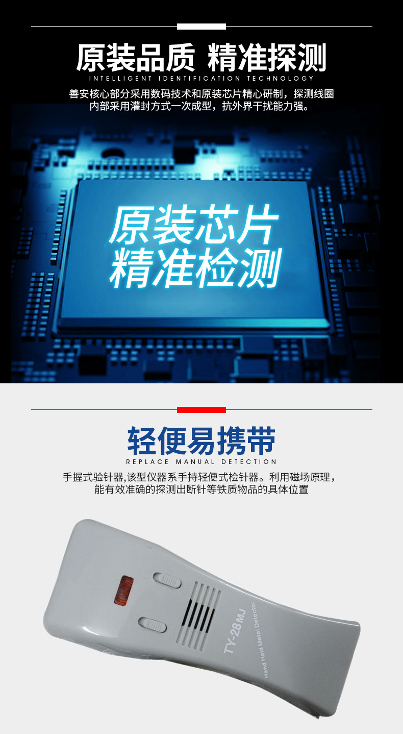 可對針織、衣料、襪、被服、皮革、鞋材等薄、小件制品進行斷針探測,能迅速正確找到斷落的鐵針斷頭。可用于五金鈕扣等服裝服飾配件進行鐵磁性雜質探查。可對人體、牲畜等工傷、刀傷、壓傷等部位進行檢查,檢查其內部是否滲進有害鐵屑物。還可用于邊防關哨檢查,公務人員對被檢人員的暗藏工具的迅速搜查。