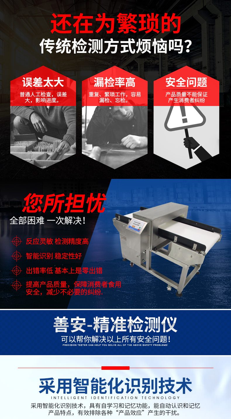 | 1 | 金屬檢測(cè)機(jī)可以識(shí)別各種磁性及非磁性金屬(如鐵、不銹鋼、銅鋁等),即便金屬內(nèi)嵌于產(chǎn)品中也可以被識(shí)別。 |